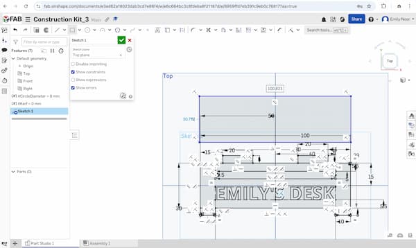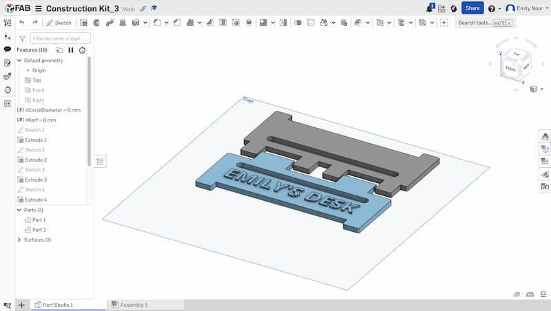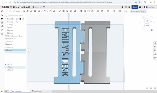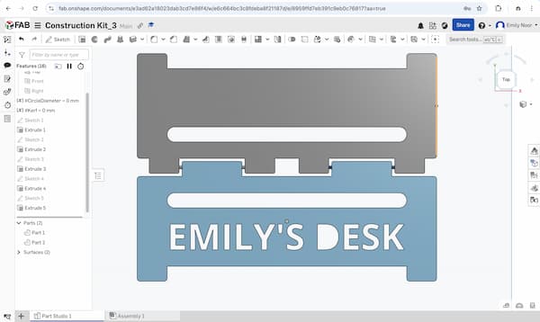 I revised the 3D design in Onshape. I increased the gap between the front and back parts and enlarged the hinge diameter to make it stronger and less likely to break. I also extruded the text “Emily’s Desk” on the front part.