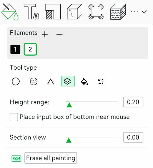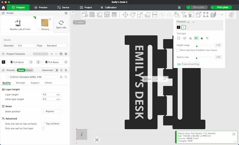 I exported the STL file and imported it into Bambu Studio for slicing. I used the Paint tool to add different colors. The tool is very easy to use: you simply add more filament, select the area you want to change, and apply the color. In this project, I used the Height Range Tool.