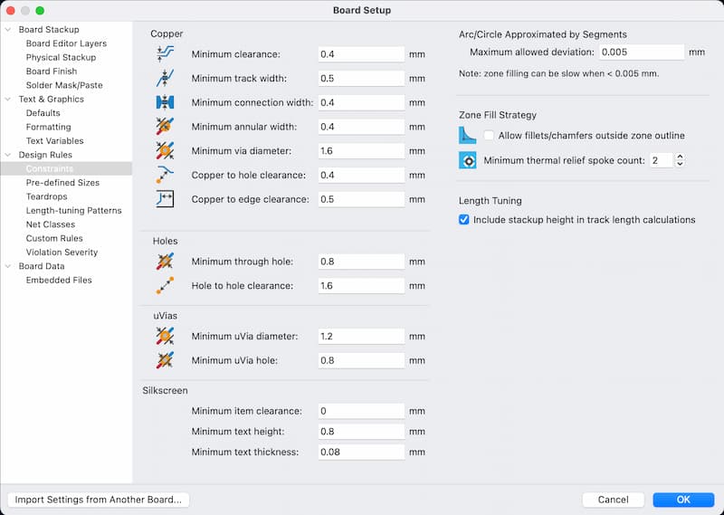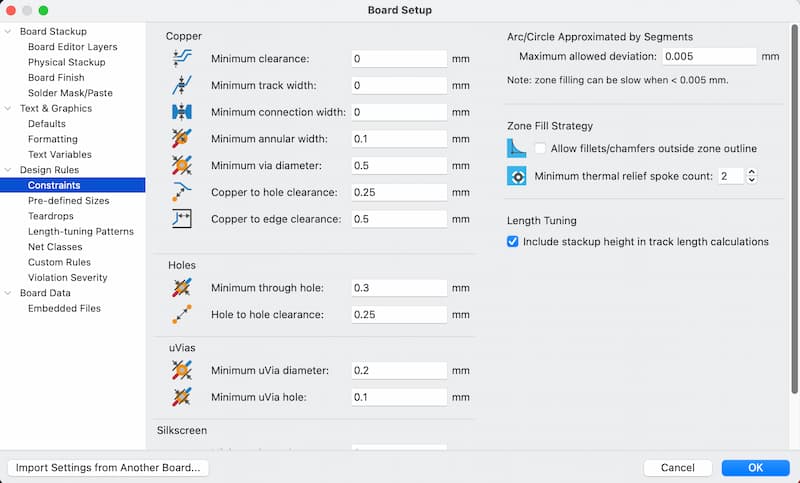 Click File -> Board Setup. The Board Setup window will appear. In the left-hand menu, select Design Rules → Constraints.
