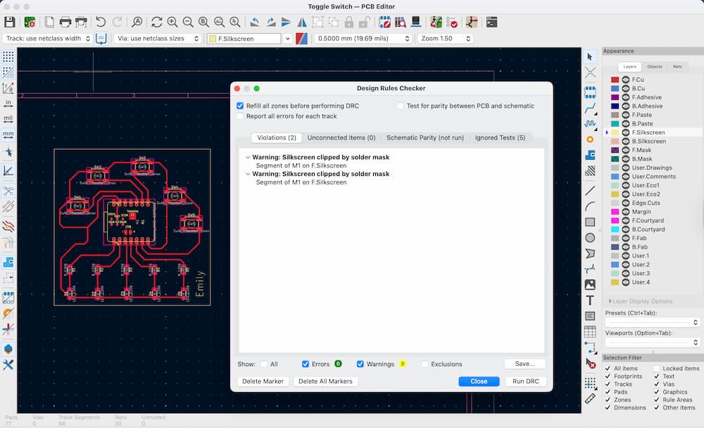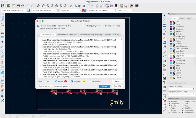 Make sure to set the design rules at the beginning. I set them after finishing my design, and when I ran the Design Rule Checker, I found sooo many errors.....