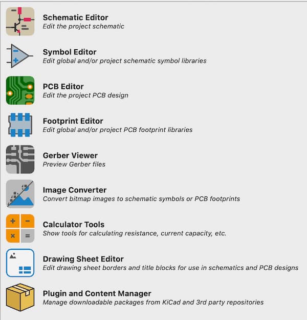 I used Kicad to design the schematic and PCB layout. These are the tools in KiCad: