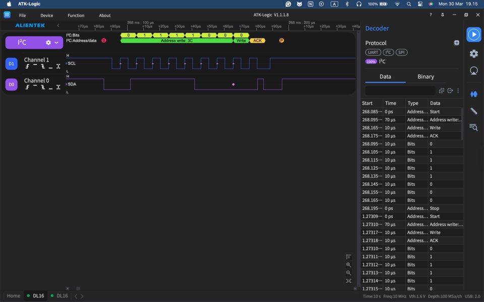 I didn’t fully understand how the logic analyzer works, so I didn’t document my progress until Week 10. In Week 10 (Output Devices), I tried to understand the logic analyzer better. I learned how the I2C interface works on the 0.96” OLED.