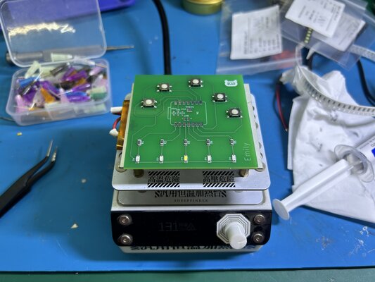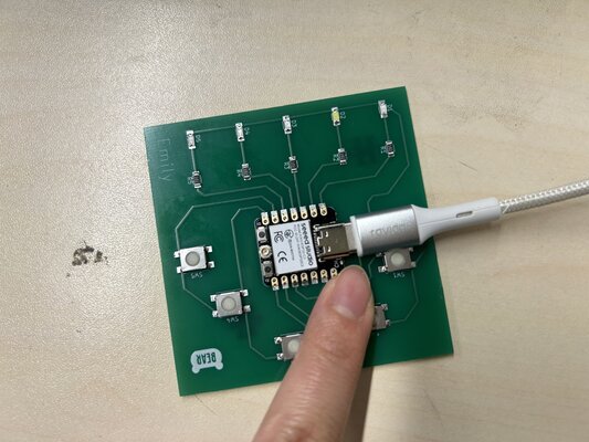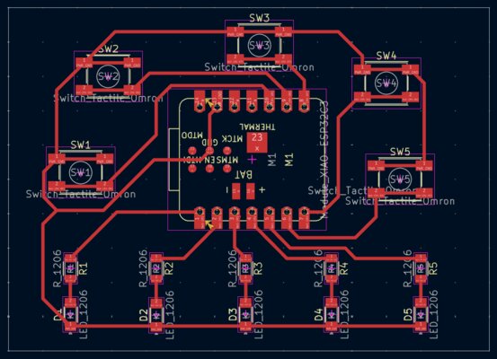 4. Then, I soldered the XIAO ESP32C3 onto the PCB. (I worked on another PCB where I did not place the SW1 button initially, because I had made a mistake: the SW1 button slightly blocked access to the USB-C port.)// LED pins const int led1 = D0; const int led2 = D1; const int led3 = D2; const int led4 = D3; const int led5 = D4; // Button pins const int button1 = D9; const int button2 = D8; const int button3 = D7; const int button4 = D6; const int button5 = D5; // LED states (remember ON or OFF) bool ledState1 = false; bool ledState2 = false; bool ledState3 = false; bool ledState4 = false; bool ledState5 = false; // Previous button states bool lastButton1 = HIGH; bool lastButton2 = HIGH; bool lastButton3 = HIGH; bool lastButton4 = HIGH; bool lastButton5 = HIGH; void setup() { pinMode(led1, OUTPUT); pinMode(led2, OUTPUT); pinMode(led3, OUTPUT); pinMode(led4, OUTPUT); pinMode(led5, OUTPUT); pinMode(button1, INPUT_PULLUP); pinMode(button2, INPUT_PULLUP); pinMode(button3, INPUT_PULLUP); pinMode(button4, INPUT_PULLUP); pinMode(button5, INPUT_PULLUP); } void loop() { // ----- BUTTON 1 ----- bool currentButton1 = digitalRead(button1); if (lastButton1 == HIGH && currentButton1 == LOW) { ledState1 = !ledState1; // TOGGLE digitalWrite(led1, ledState1); delay(200); // debounce } lastButton1 = currentButton1; // ----- BUTTON 2 ----- bool currentButton2 = digitalRead(button2); if (lastButton2 == HIGH && currentButton2 == LOW) { ledState2 = !ledState2; digitalWrite(led2, ledState2); delay(200); } lastButton2 = currentButton2; // ----- BUTTON 3 ----- bool currentButton3 = digitalRead(button3); if (lastButton3 == HIGH && currentButton3 == LOW) { ledState3 = !ledState3; digitalWrite(led3, ledState3); delay(200); } lastButton3 = currentButton3; // ----- BUTTON 4 ----- bool currentButton4 = digitalRead(button4); if (lastButton4 == HIGH && currentButton4 == LOW) { ledState4 = !ledState4; digitalWrite(led4, ledState4); delay(200); } lastButton4 = currentButton4; // ----- BUTTON 5 ----- bool currentButton5 = digitalRead(button5); if (lastButton5 == HIGH && currentButton5 == LOW) { ledState5 = !ledState5; digitalWrite(led5, ledState5); delay(200); } lastButton5 = currentButton5; }After confirming that the code worked properly, I placed the SW1 button on the board. This time, I tried using a hot air gun, but I found that the soldering hot plate is more convenient.