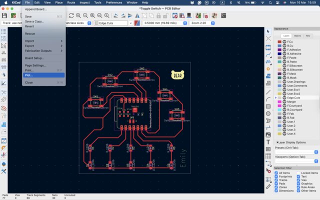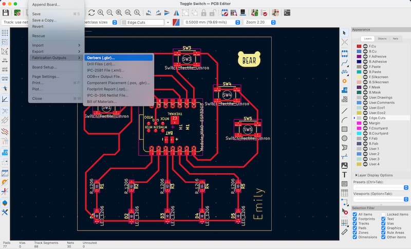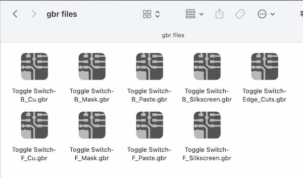 Before going to the JLCPCB website, I first prepared the Gerber files (.gbr) in KiCad: