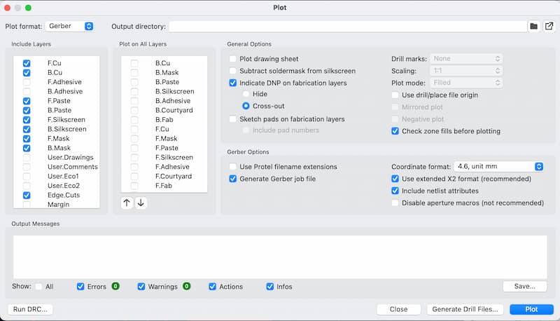 You can choose which layers you want to export. I selected the following layers: F.Cu, B.Cu, F.Paste, B.Paste, F.Mask, F.Silkscreen, B.Silkscreen, F.Mask, B.Mask, Edge.Cuts