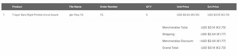 Description Price 5 Circuit Board USD $3.14 (€2.73) Shipping USD $2.04 (€1.77) Discount -USD $2.04 (€1.77) Grand Total USD $3.14 (€2.73)
