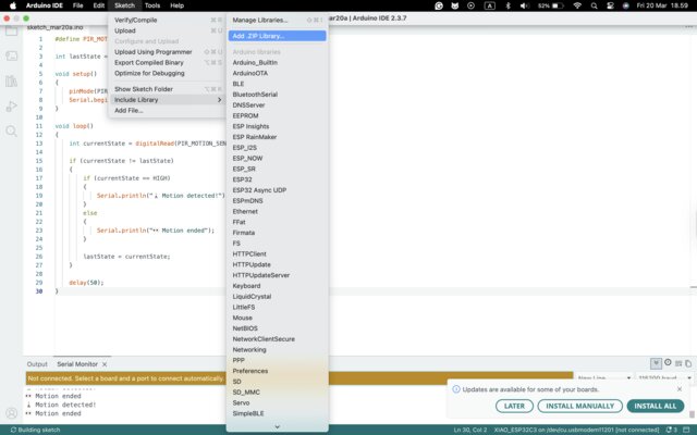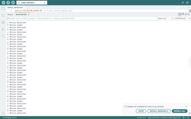 6. If motion just started -> “🚶 Motion detected!”, if motion just stopped -> “👀 Motion ended”#define PIR_MOTION_SENSOR D2 // 👈 use a Grove digital port int lastState = LOW; void setup() { pinMode(PIR_MOTION_SENSOR, INPUT); Serial.begin(115200); } void loop() { int currentState = digitalRead(PIR_MOTION_SENSOR); if (currentState != lastState) { if (currentState == HIGH) { Serial.println("🚶 Motion detected!"); } else { Serial.println("👀 Motion ended"); } lastState = currentState; } delay(50); }