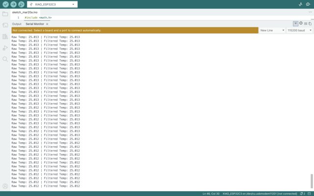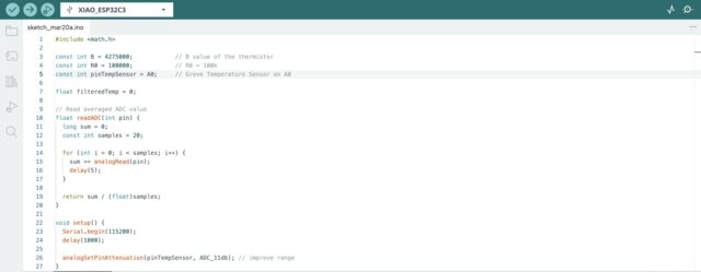 #include <math.h> const int B = 4275000; // B value of the thermistor const int R0 = 100000; // R0 = 100k const int pinTempSensor = A0; // Grove Temperature Sensor on A0 float filteredTemp = 0; // Read averaged ADC value float readADC(int pin) { long sum = 0; const int samples = 20; for (int i = 0; i < samples; i++) { sum += analogRead(pin); delay(5); } return sum / (float)samples; } void setup() { Serial.begin(115200); delay(1000); analogSetPinAttenuation(pinTempSensor, ADC_11db); // improve range } void loop() { float a = readADC(pinTempSensor); // Convert ADC to resistance float R = R0 * (4095.0 / a - 1.0); // Convert resistance to temperature float temperature = 1.0 / (log(R / R0) / B + 1 / 298.15) - 273.15; // Smooth output (low-pass filter) if (filteredTemp == 0) { filteredTemp = temperature; // initialize } else { filteredTemp = 0.85 * filteredTemp + 0.15 * temperature; } // Output Serial.print("Raw Temp: "); Serial.print(temperature, 3); Serial.print(" | Filtered Temp: "); Serial.println(filteredTemp, 3); delay(200); }