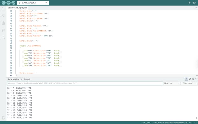 9. In the Serial Monitor, we can see the time, date, and day:#include <Wire.h> #include "DS1307.h" #define SDA_PIN 6 #define SCL_PIN 7 DS1307 rtc; // renamed from "clock" to "rtc" void setup() { Serial.begin(115200); Wire.begin(SDA_PIN, SCL_PIN); rtc.begin(); // Set time once, then comment out rtc.fillByYMD(2026, 3, 20); rtc.fillByHMS(12, 0, 0); rtc.fillDayOfWeek(FRI); rtc.setTime(); } void loop() { printTime(); delay(1000); } void printTime() { rtc.getTime(); Serial.print(rtc.hour, DEC); Serial.print(":"); Serial.print(rtc.minute, DEC); Serial.print(":"); Serial.print(rtc.second, DEC); Serial.print(" "); Serial.print(rtc.month, DEC); Serial.print("/"); Serial.print(rtc.dayOfMonth, DEC); Serial.print("/"); Serial.print(rtc.year + 2000, DEC); Serial.print(" "); switch (rtc.dayOfWeek) { case MON: Serial.print("MON"); break; case TUE: Serial.print("TUE"); break; case WED: Serial.print("WED"); break; case THU: Serial.print("THU"); break; case FRI: Serial.print("FRI"); break; case SAT: Serial.print("SAT"); break; case SUN: Serial.print("SUN"); break; } Serial.println(); }