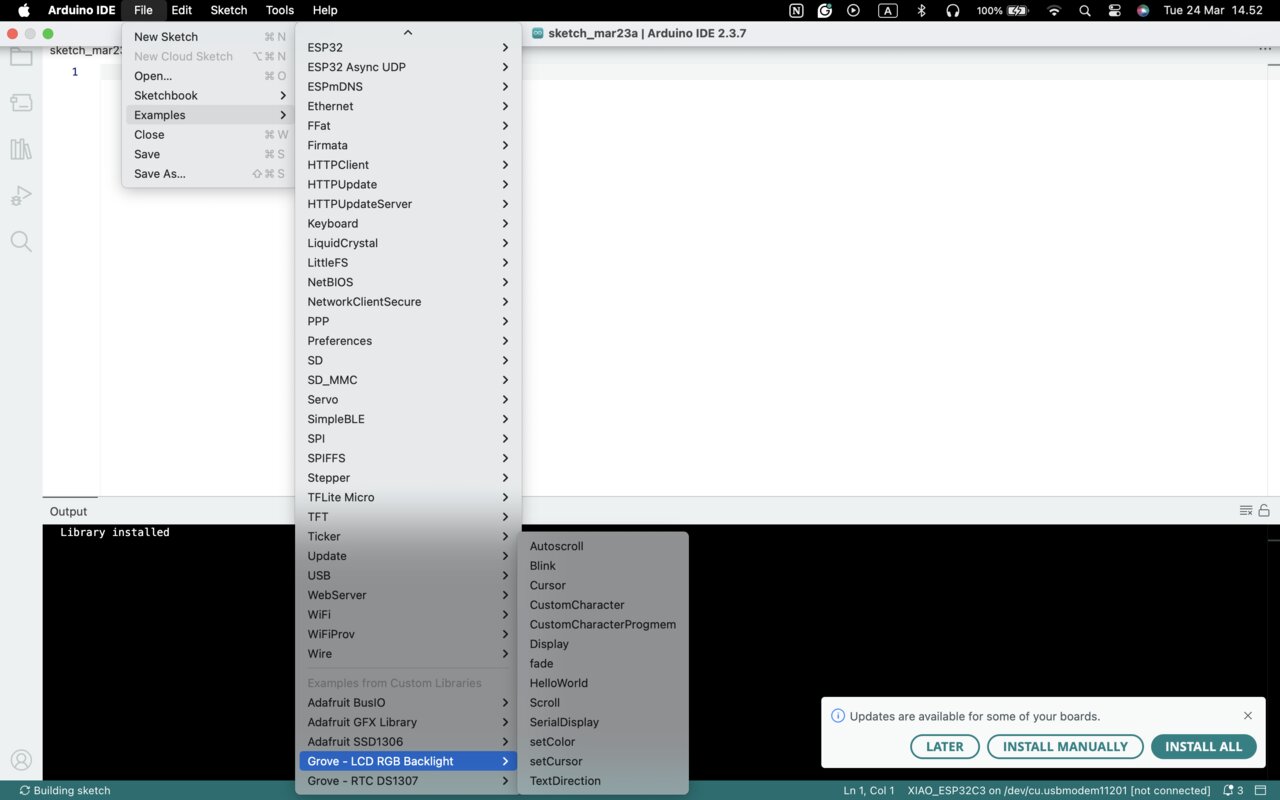 File -> Examples -> Grove - LCD RGB Backlight -> choose an example, I chose “HelloWorld”.