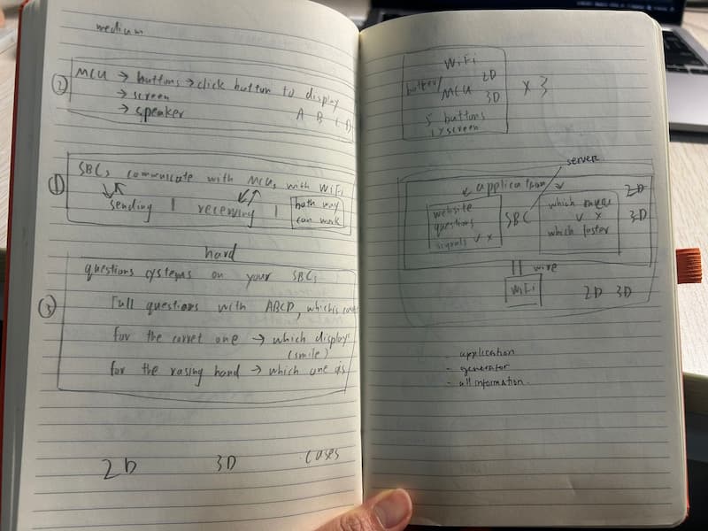 I’ve always loved creating or hosting games for my friends. Last time, I hosted a game underground, but there was no internet access, so we couldn’t play games like Kahoot. Moreover, I always had a hard time to figure out who’s the first to raise their hands or the quickest one to answer. Because of that, I came up with the idea of creating a quiz-style game using a game console connected via Bluetooth. Each group would have its own console connected to a big screen. The big screen would display the questions. If a group wants to answer a question, they can press a “raise hand” button. For multiple-choice questions, they can select the A, B, C, or D button. There is also a small screen on the console to show if their answer is correct or wrong.