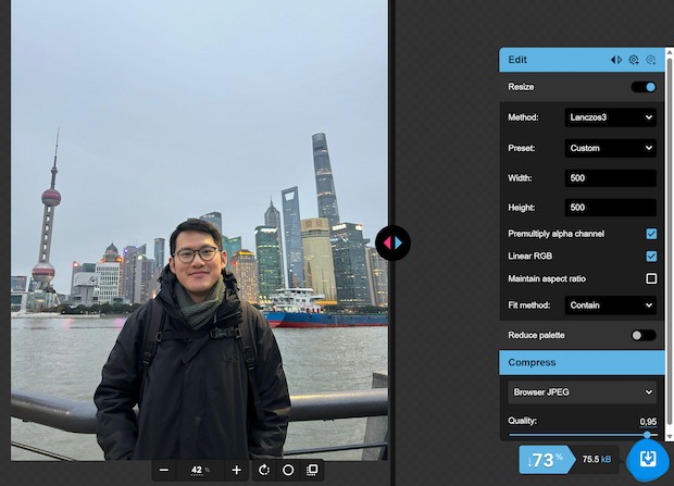 Only by changing the width, size, fit method to contain, compression to browser JPG, and expected quality to stay at 95%, the file size of that picture is reduced from 270 kb to 75 kb (37% of its original size)