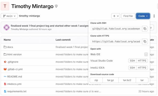 GitLab is a web-based platform that uses Git for version control for hosting Git repositories (like Github), but it's open-source. One of its key features is GitLab Continous Integration (CI), which allows users to define pipelines that automatically build, test, and deploy code whenever changes are pushed to the repository. Without the CI feature and the combination of user-defined yaml file (sets of instructions), changes are not automatically reflected - in this case the user's personal Fab Academy 2026 website - and repetitive manual steps need to be done to be able to see the changes that are made from the back-end to the front-end i.e. not live.