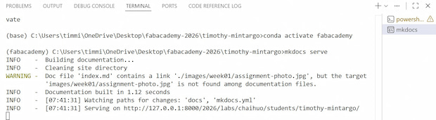 The starting template to work MkDocs is available at the Fab Academy GitLab repo, and details on how to install the MkDocs as well as Material for MkDocs package are readily available online.