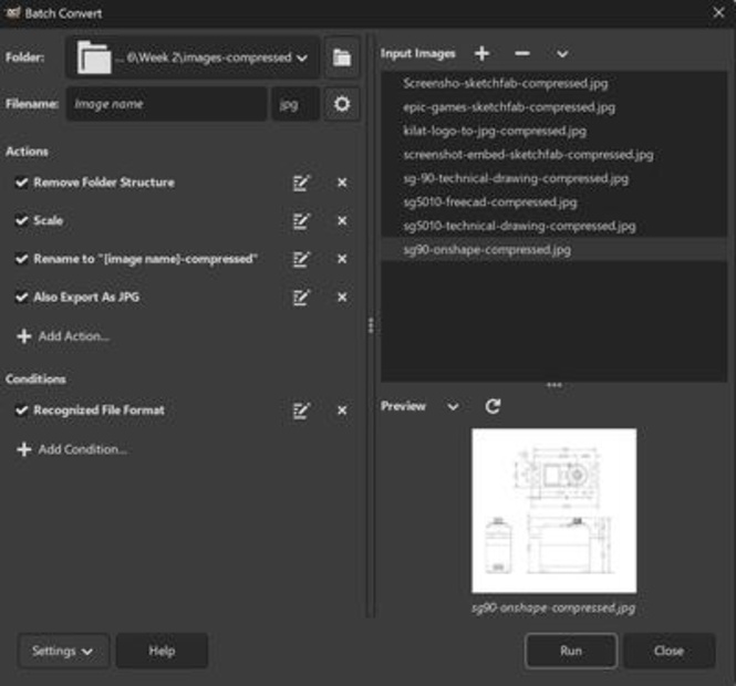 Previously, the Squoosh tool was used to compress images one by one. While this worked well for a small number of files, it becomes cumbersome when dealing with longer documentation that requires a large number of images. Thus the Batcher plugin at Inkscape and ImageMagick is used to test the batch workflow.
