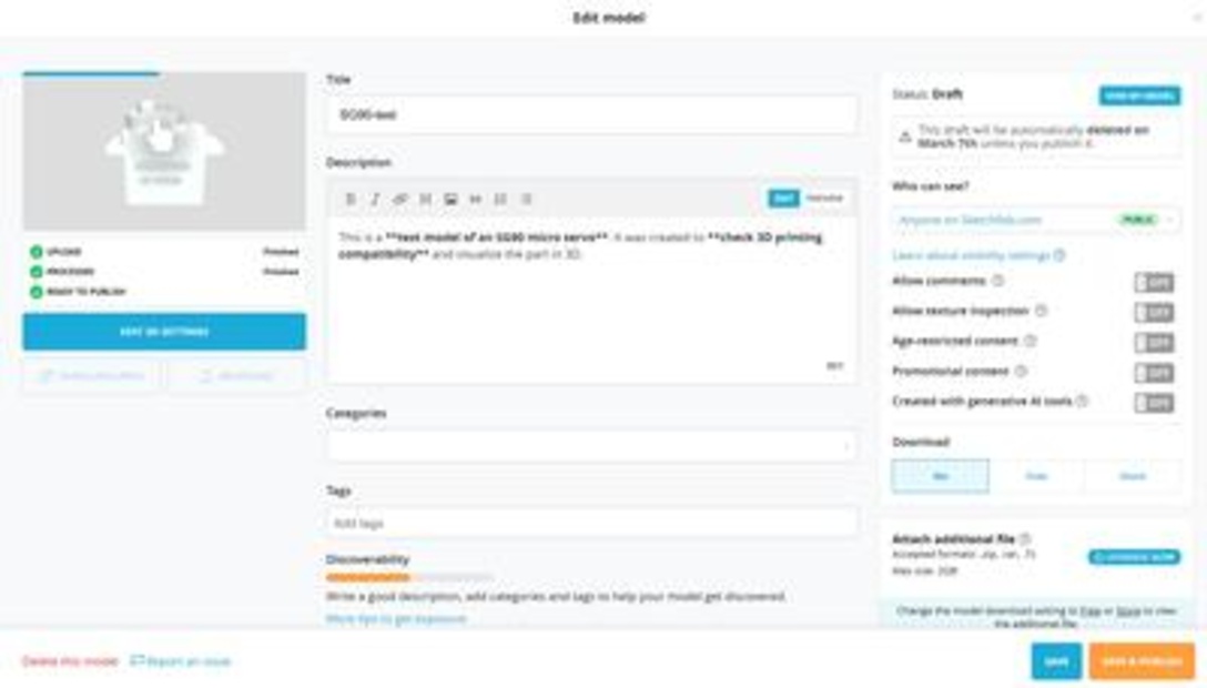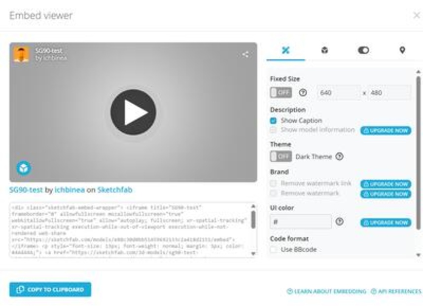 After a successful sign up and STL file uploaded (with title and description), the 3D model can be showcased on the personal website by copying the embed code from the uploaded model’s Embed section on Sketchfab and inserting it into the file.