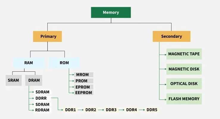 Secondary memory : External to the CPU. Slower but larger in capacity (e.g. HDD, SSD, USB drive, flash)
