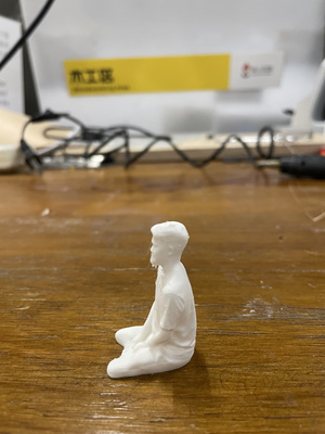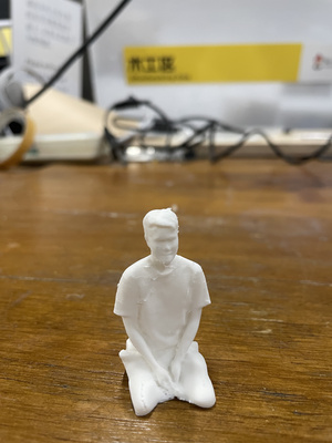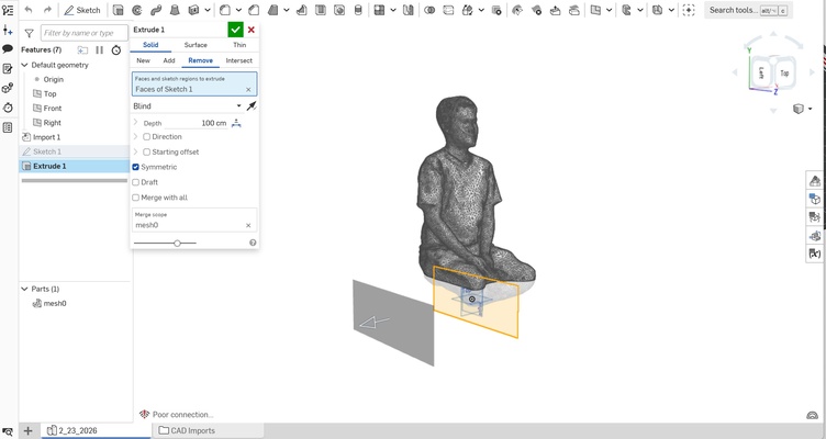 The resulting 3D scan is quite accurate and visually detailed such as cloth wrinkles, especially considering that it was conducted outdoors with uncontrolled lighting conditions. Since the goal is 3D printing the object rather than achieving perfect scan quality, the current result is deemed sufficient, and no further post-processing is done except the need to flatten the bottom part of the object (else the 3D print will not be mechanically stable). At the time of writing, the free version of Polycam only allows export in GLB format - fortunately, Onshape accepts this file format and simple extrusion is sufficient to achieve the desired outcome.