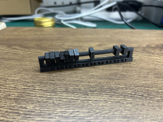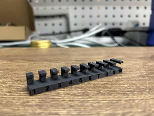 Aim of test : To determine ideal spacing/clearing of moving and interlocking parts. The diameter of the axle is 2.5 mm, and the numbers engraved on the 3D print indicate the circular gap in each rectangle (e.g. for 0.3 mm clearance, the actual circular diameter is 2.8mm)