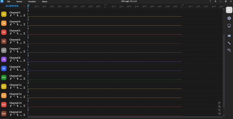 The software corresponding to this logic analyzer must first be installed so that the device could be connected to the computer. The appearance of the channels at the interface indicates that connection is successfuly established between the two.