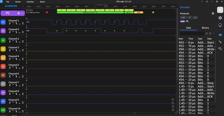- Select the appropriate communication protocol (e.g. I2C, SPI, UART) at the decoder tab