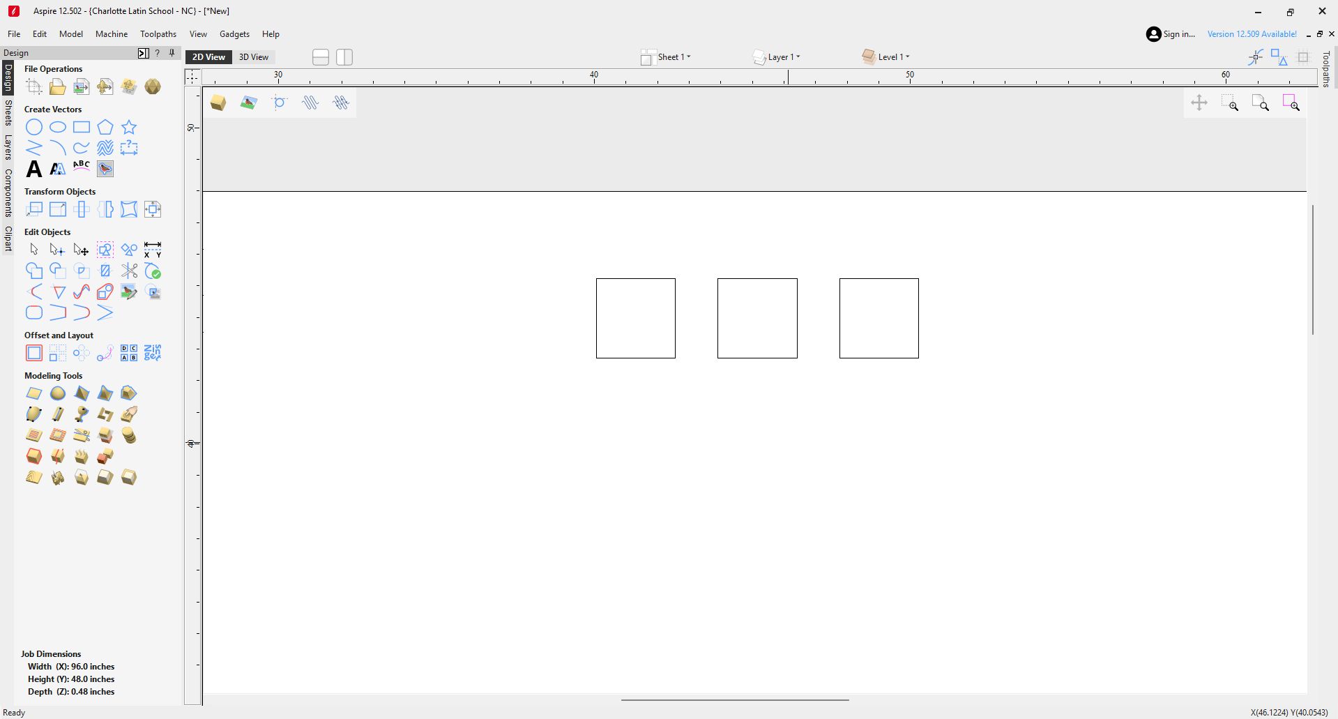 To start, I opened a new aspire file and confirmed its settings according to the wood I was to cut on. It ended up having dimension of 96.0” x 48.0” x 0.48”. I also set the z-zero position to Machine Bed. From there, I proceeded to create 3 2.5” x 2.5” squares in the workspace. Each square would test a separate profile toolpath orientation.