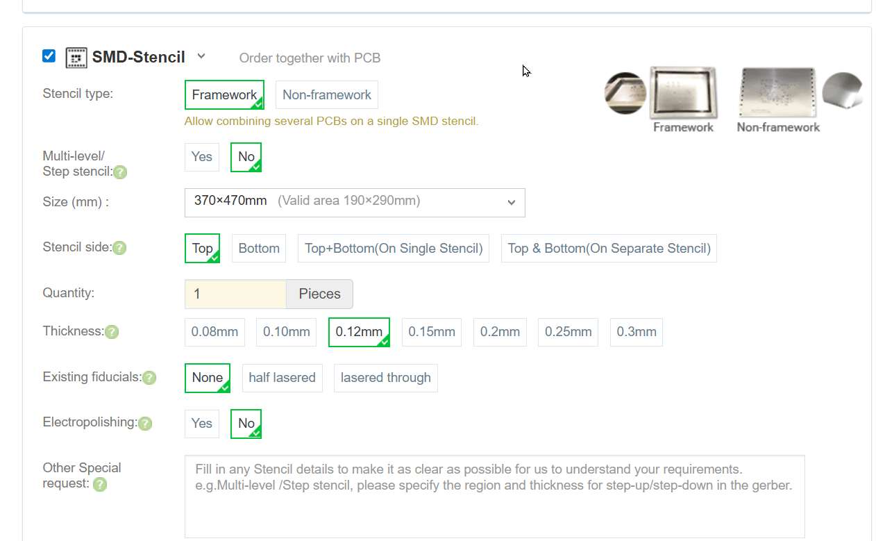 If you have a large number of SMD components, they have the option to order a custom stencil using your GBR files: