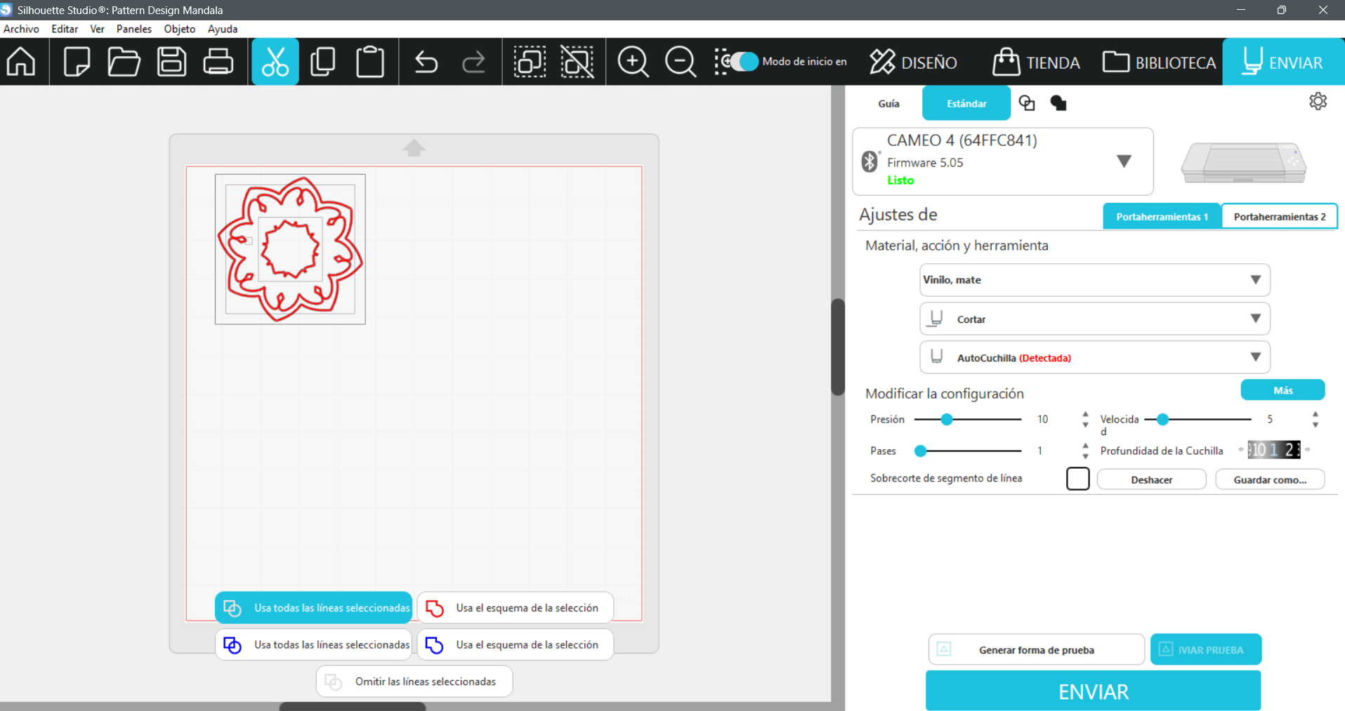 The machine correctly detected the AutoBlade, which automatically adjusts the cutting depth based on the selected material. However, this parameter was manually adjusted to optimize cutting performance and ensure proper material separation.