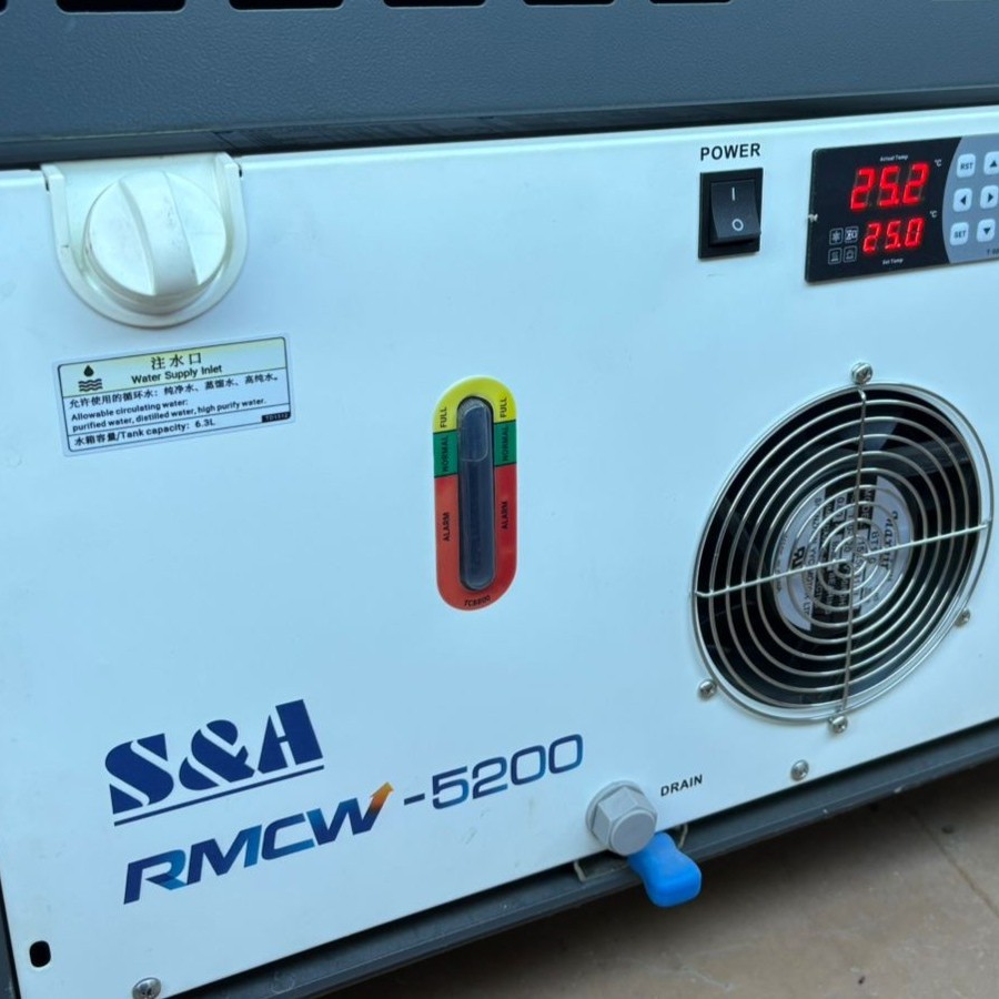 - Cooling chiller: The operating temperature of the CO₂ laser was verified. In this case, it was slightly below the optimal range, so the system was filled with distilled water and proper operation of the cooling system was ensured.