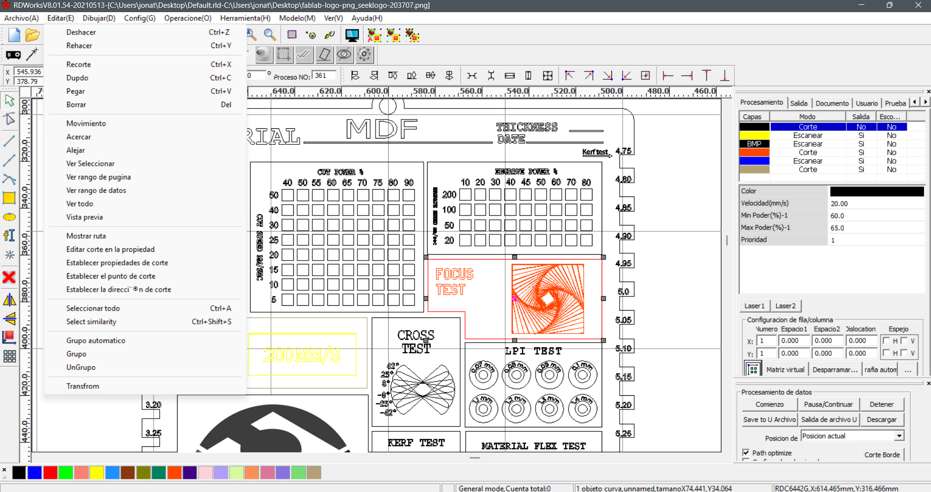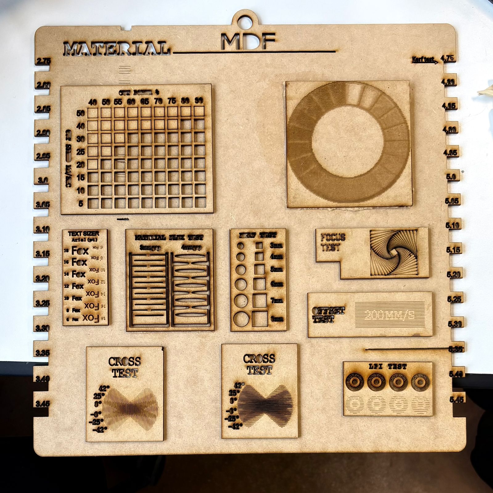 - Power and speed matrix: A grid combining different power percentages and cutting speeds was generated to identify the optimal configuration for clean cuts without excessive burning on MDF.