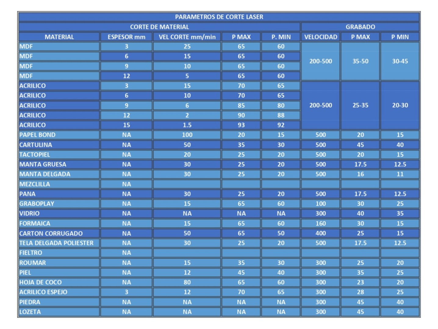 Based on the training carried out in our laboratory, the corresponding tests were performed on the equipment to characterize parameters such as power, speed, and type of cut.