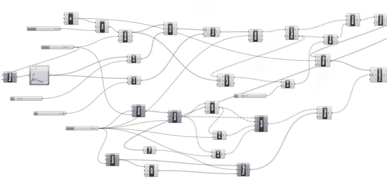Modeling was carried out in Rhinoceros using Grasshopper to design organic forms that enable parametric design and allow modification of the dynamic behavior of the surfaces. These models were developed to perform behavioral tests during 3D printing and to analyze the characteristics of PLA material under elevated temperature conditions.