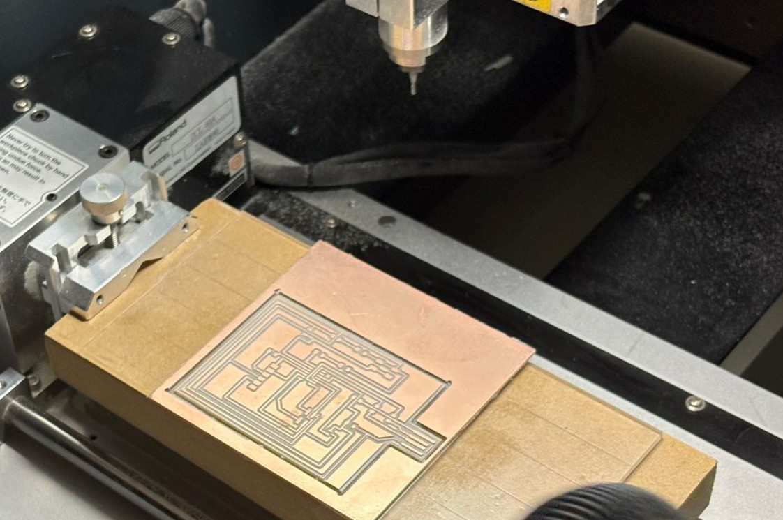 The material thickness was measured to ensure it met the dimensions of the designed traces. In this case, a V-bit was used for the trace milling and a flat end mill was used for cutting the board.