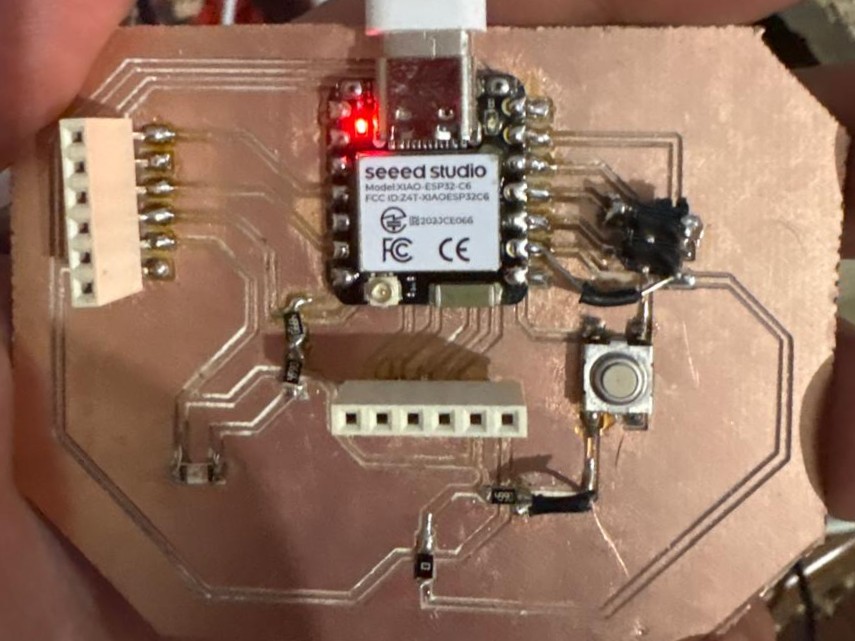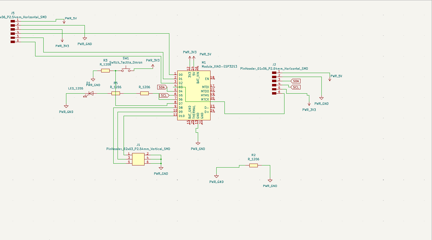 The electronic design of the board was using KiCad; ESP32C6, headers, resistors, LED, and communication lines such as SDA and SCL.