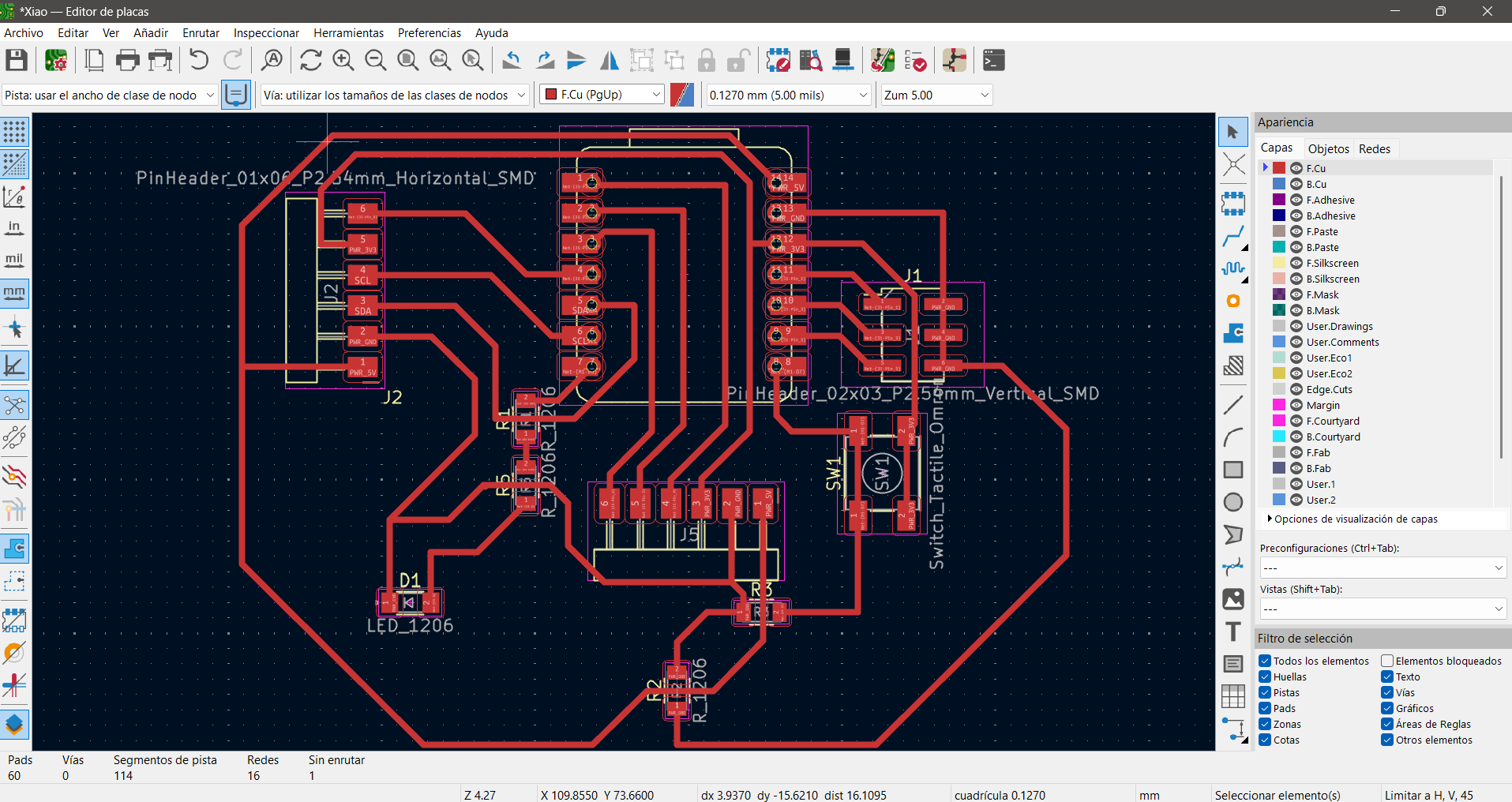 The components used in this PCB are surface-mount devices (SMD); Resistors, LEDs, and pin headers. Small size makes them sensitive to alignment and heat control.