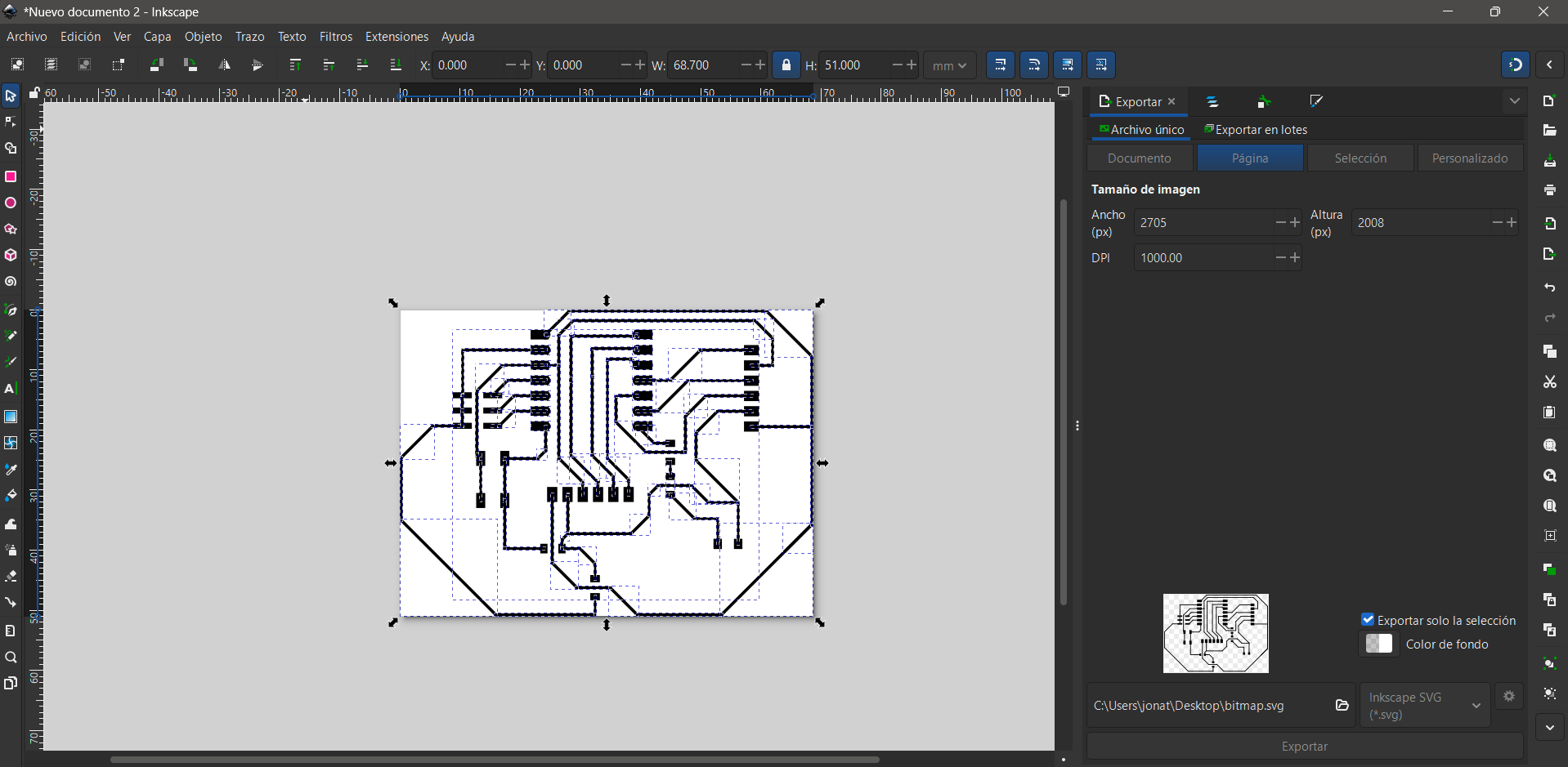 The design was exported as SVG and prepared for fabrication using Inkscape and Mods. The traces were converted into a black-and-white image to generate the toolpaths . However, this stage introduced several challenges, because High DPI values and an excessive number of offsets generated files that were too large, causing the machine to stop processing at around 30% of the job.