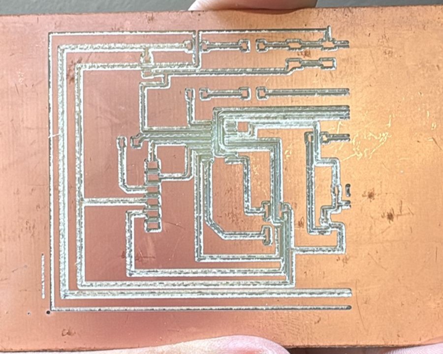 These issues directly affected the milling results: insufficient cutting depth prevented the complete removal of copper, while incorrect tool configurations caused burrs or lifted traces. Through this process, it became clear that PCB fabrication depends not only on having a correct design but also on properly preparing and optimizing the files and machining parameters for the milling process.
