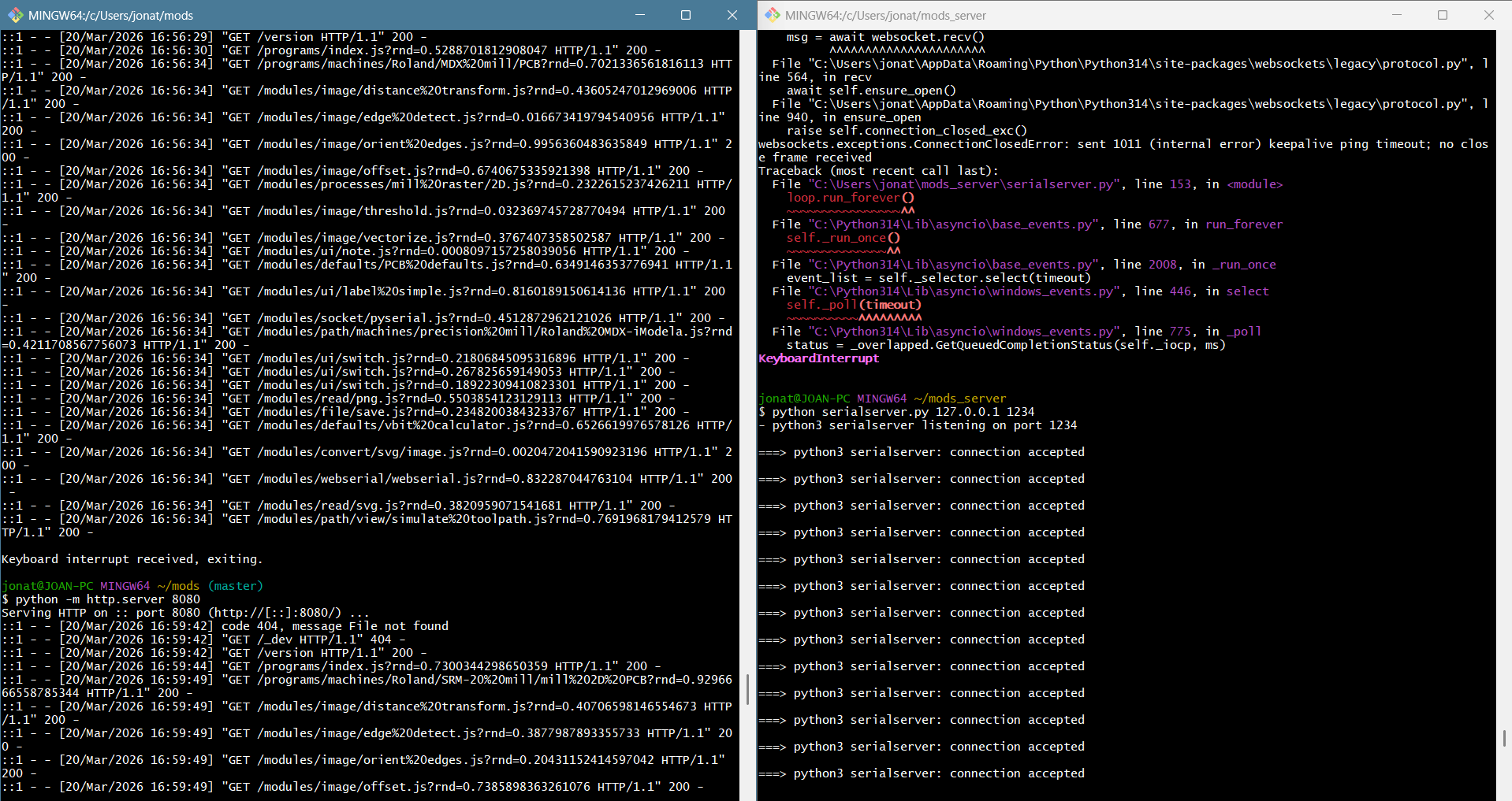 The workflow involved establishing communication between Mods and the Roland MDX-20 using a local server to run Mods, while simultaneously executing a Python serial server (serialserver.py) that acts as an interface between the system and the machine.