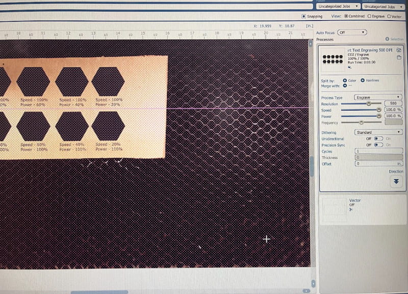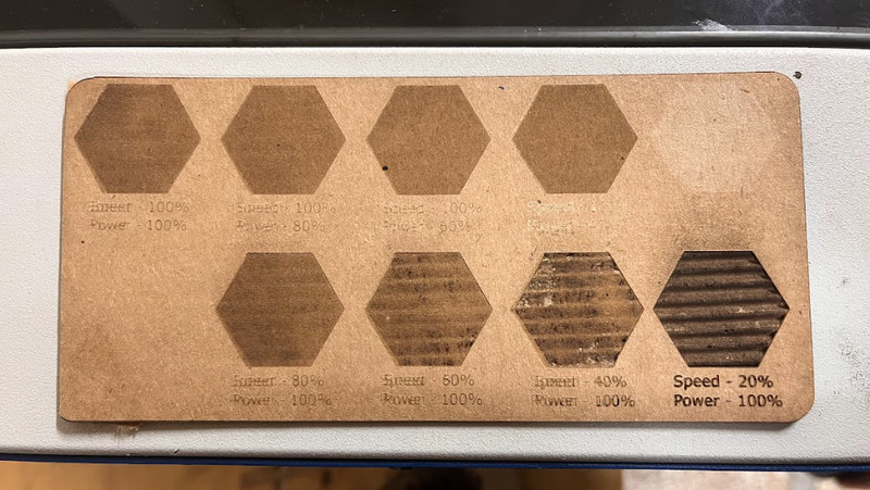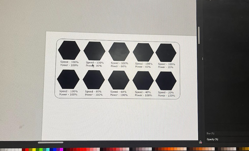 We began by experimenting with different power and speed values to see how they affect engraving.