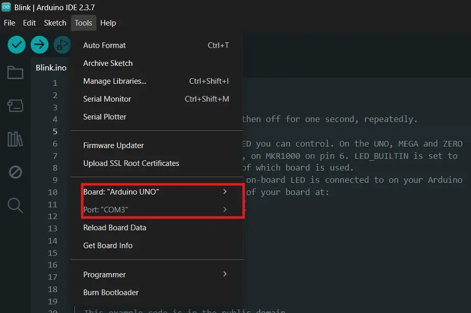 For the Arduino UNO R3 we first connected the board to the computer and then uploaded the code. Don’t forget to add the board and the port!