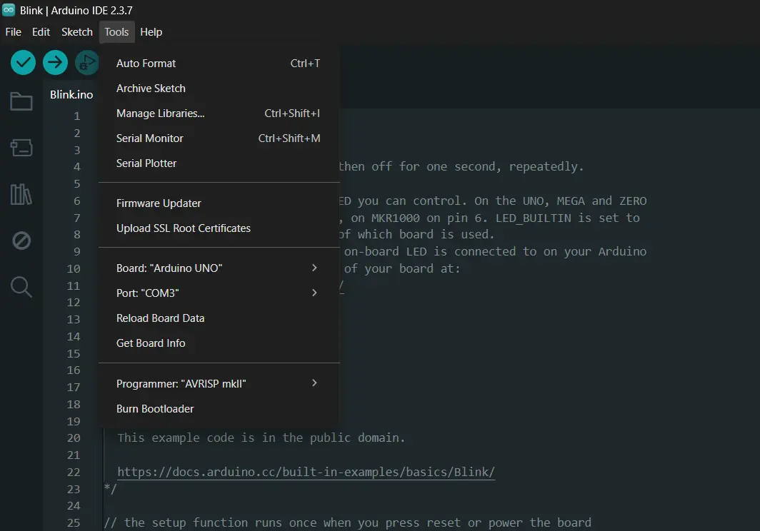 After that, use the default Blink code but change the pin number to the one your LED is connected to. Our pin is PA2.