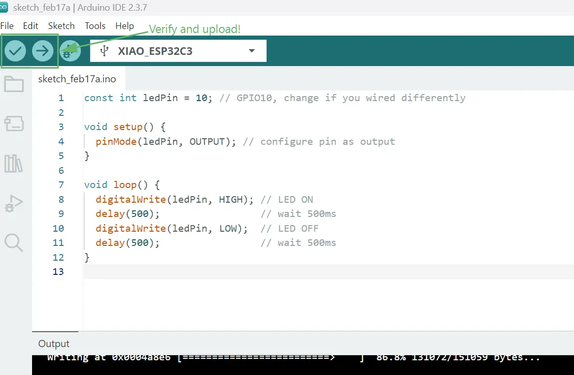 We used the same code, but since the XIAO ESP32C3 doesn’t have a built-in LED, we used the GPIO10 pin to turn an external LED on and off. Don’t forget to add the board and the port!