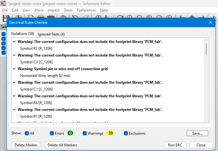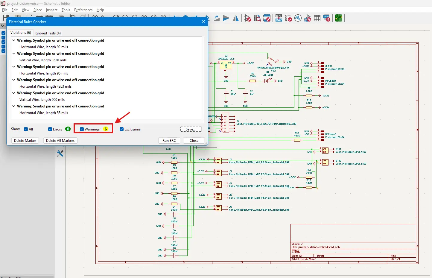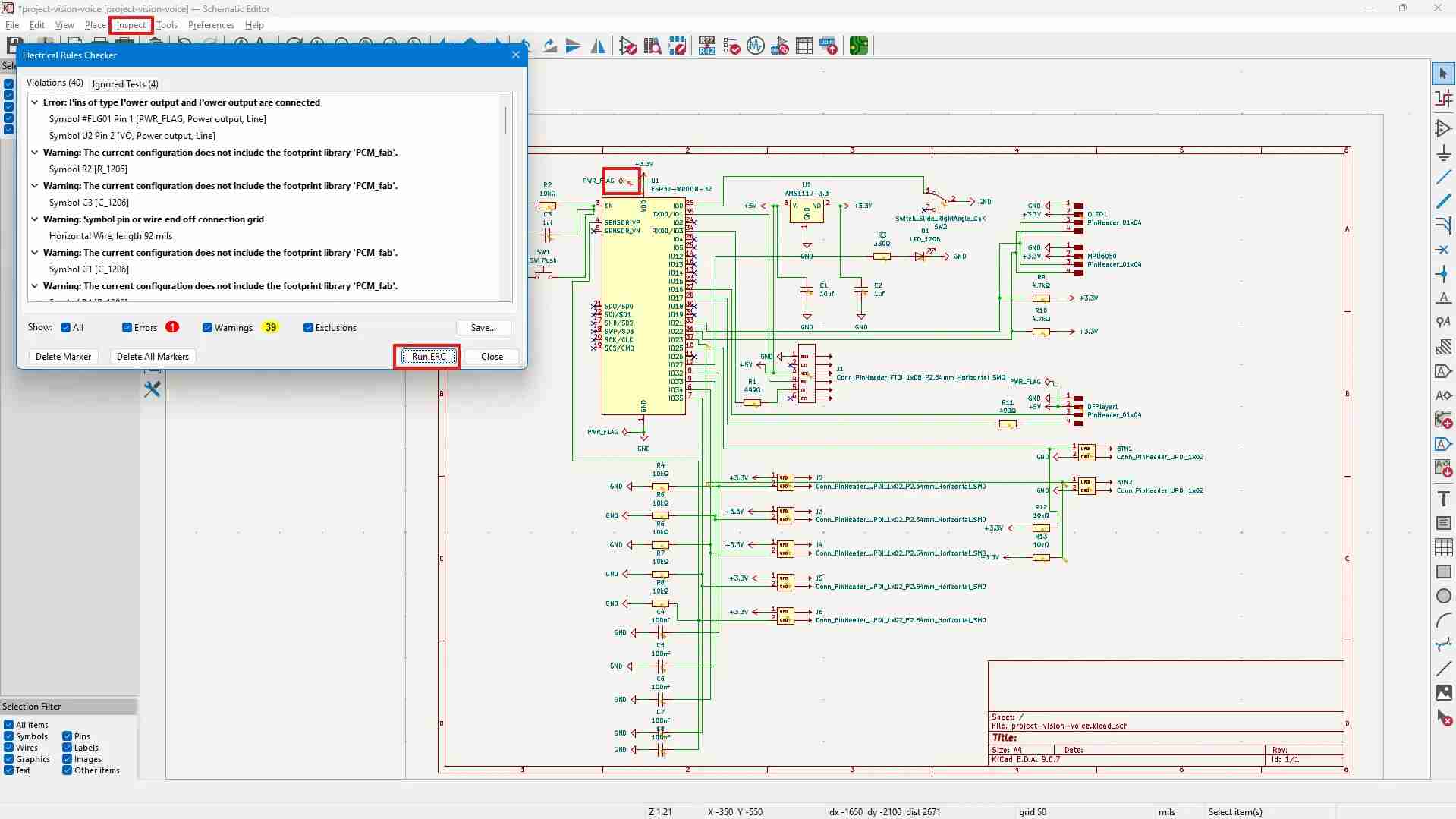 Now that everything was connected, I ran the Electrical Rule Checker to check for any issues with my circuit. I got 1 error and had to do some fixes. (I removed the PWR_FLAG symbol ^-^)