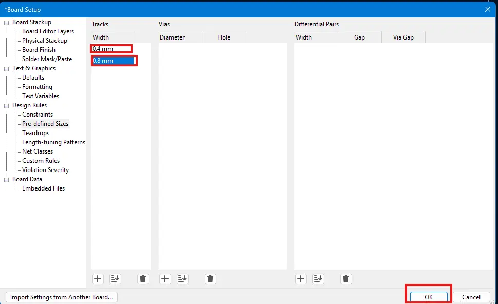 - 0.6 mm = For edge cutting traces and Signal Traces