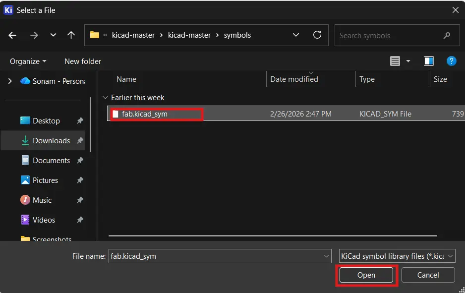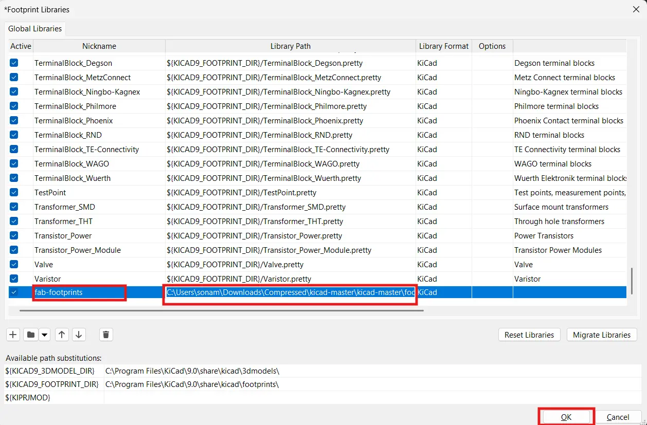 To import them, I opened KiCad and clicked Preference > Manage Fab Libraries. Then I selected the fab libraries and imported them.