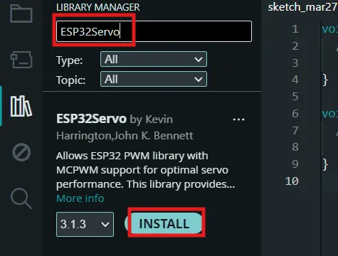 I installed ESP32Servo by Kevin Harrington from the Library Manager. The standard Arduino Servo.h doesn't work on the ESP32-C3 — you need this specific one.