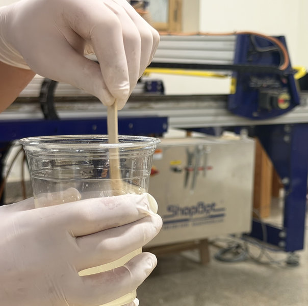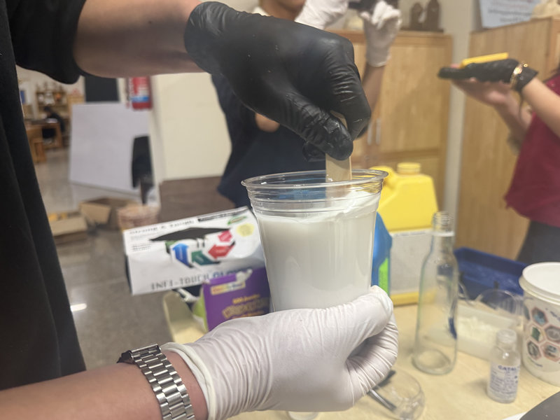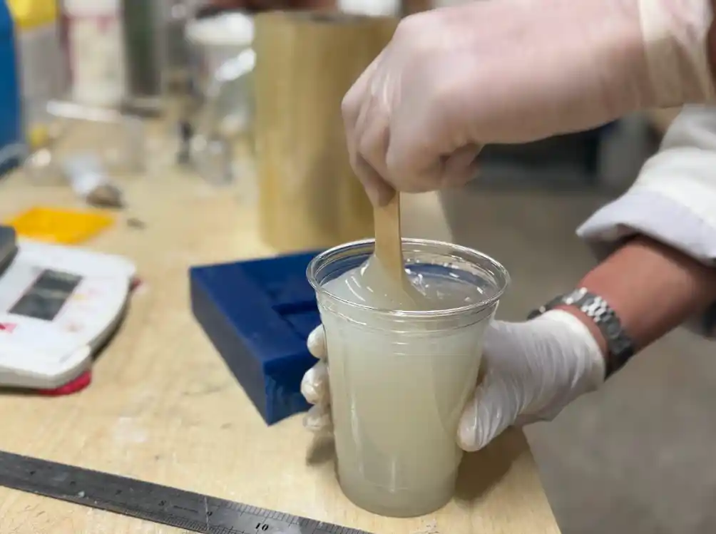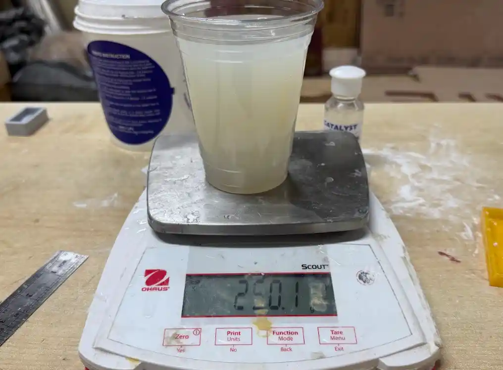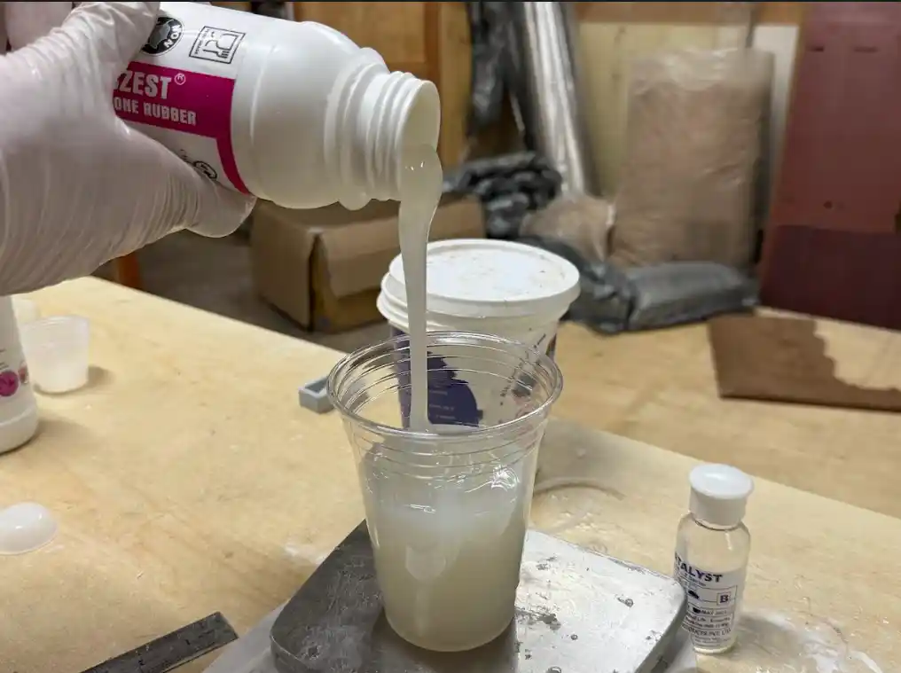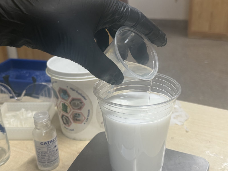 We first added Part A which is the silicon rubber to the mixing container and then added Part B which is the catalyst. We then mixed them together thoroughly to make sure the catalyst was evenly distributed throughout. We mixed for about 3 to 5 minutes to make sure it was well combined.