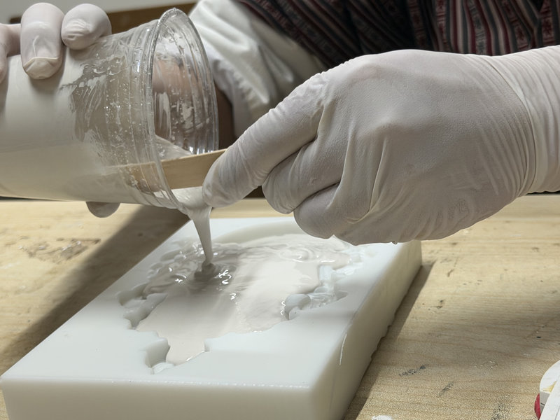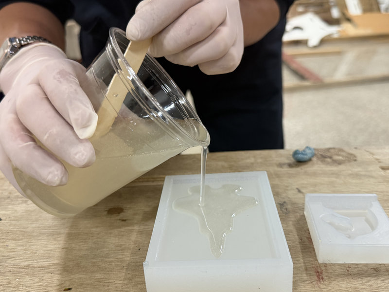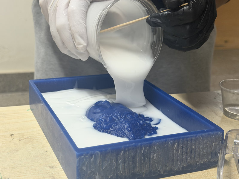 Then we carefully poured the mixture into the mold making sure not to create any air bubbles and filling it up completely to get a good negative mold.