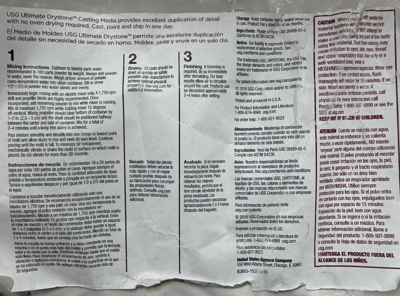USG Ultimate Drystone is a fast setting gypsum casting powder. It hardens quickly without oven drying and captures fine details really well. Here are the key details from the datasheet: