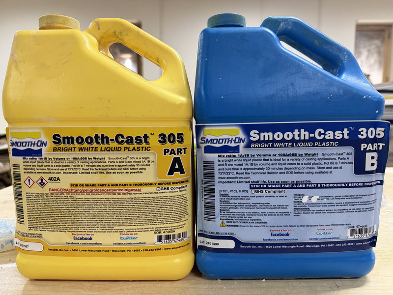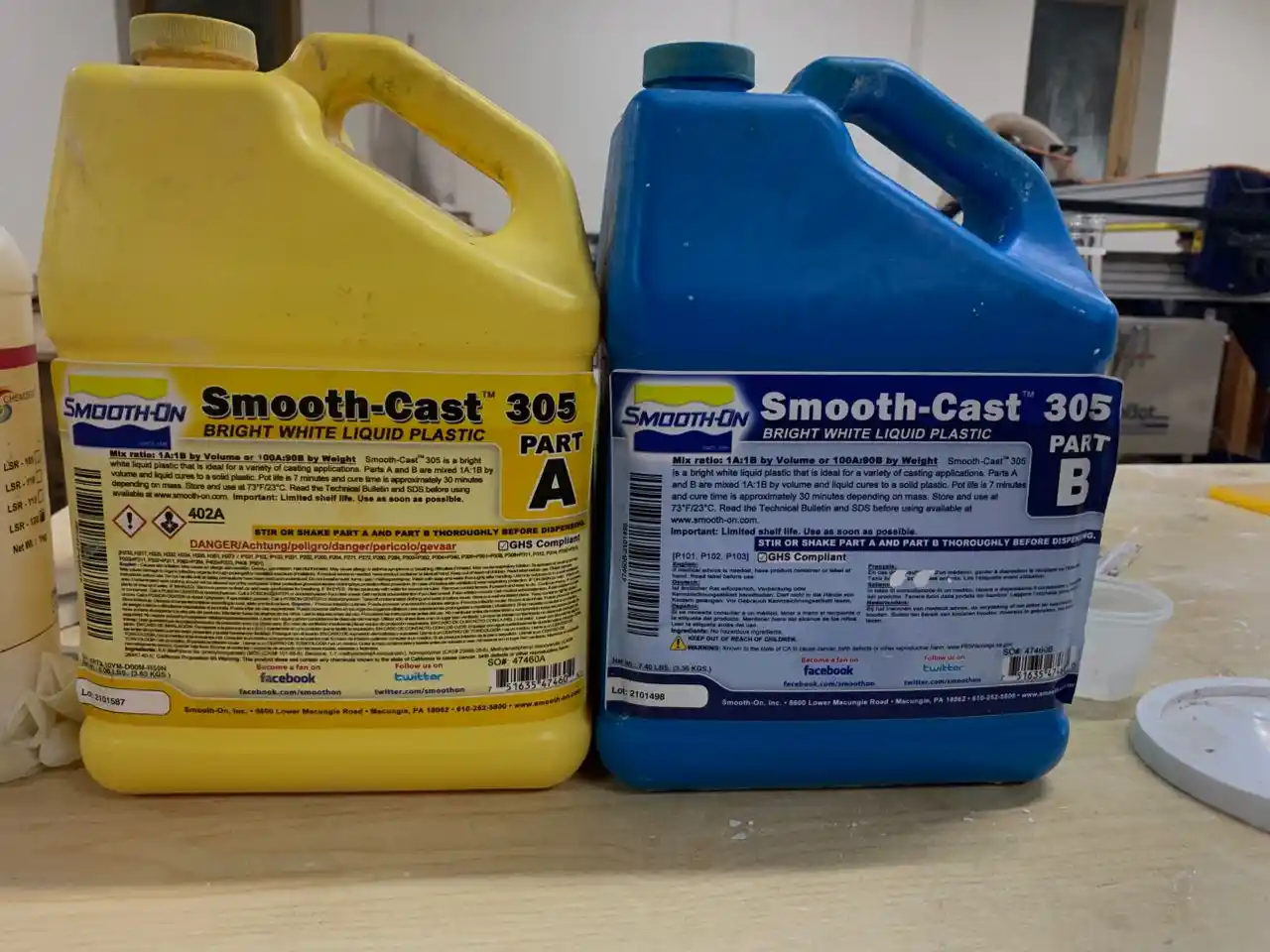 A few important things to keep in mind when using Smooth-Cast 305. Make sure to pre-mix both parts before measuring them. Then measure equal amounts of Part A and Part B, combine them and mix thoroughly for about 3 minutes. After that pour the mixture carefully into the mold making sure there are no air bubbles and that the mold is filled completely.